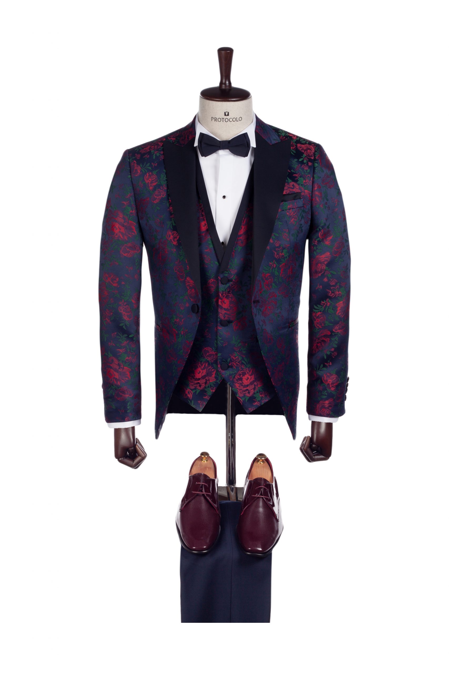 Este smoking de tres piezas, está coordinado con su chaleco a juego viveado en raso azul al igual que la americana del smoking y con su pajarita azul de raso. Se trata del smoking modelo Grado. La camisa blanca de cuello pajarita con tapeta y botonadura de perla negra. La camisa es el modelo Parama.Y para los más clásicos un zapato de charol negro o un zapato oxford con cordones negro, y para los que buscan más moda y colorido un zapato granate.
