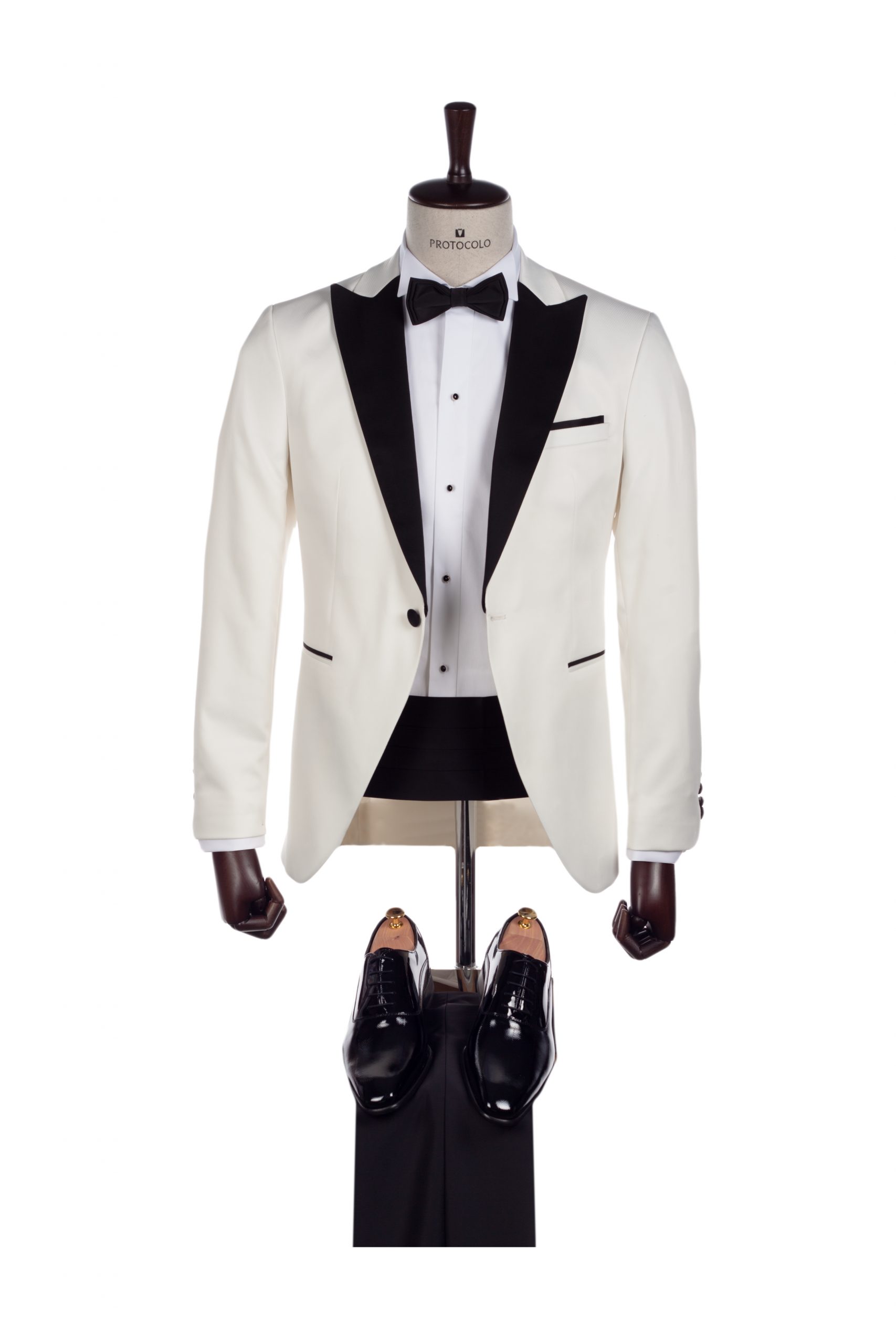 Smoking crudo elegantísimo para cualquier ocasión. Consta de americana blanca con solapa y vivos en raso negro y su pantalón slim de color negro. Coordinado con su pajarita y fajín de raso negro. Es el smoking Alcubierre de nuestra colección.