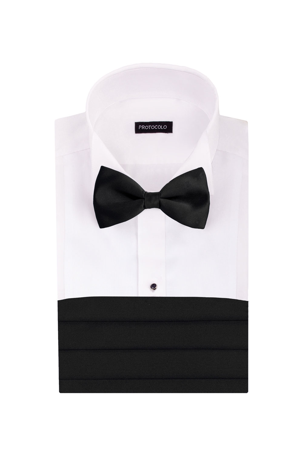 Lo acompaña nuestra camisa de algodón 100% con tapeta, puños para gemelos, cuello pajarita y los zapatos negros Oxford de piel con cordones. Es la camisa Bormio y el zapato Laron negro.