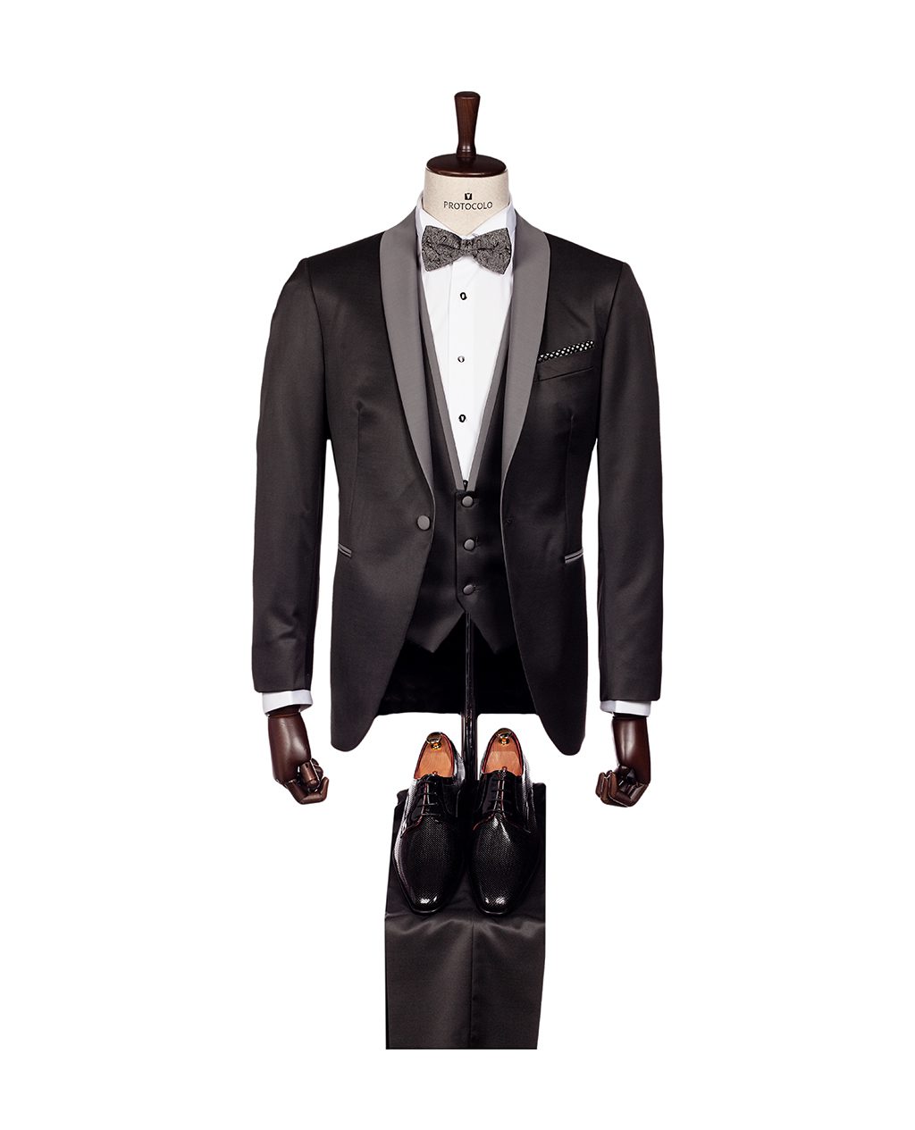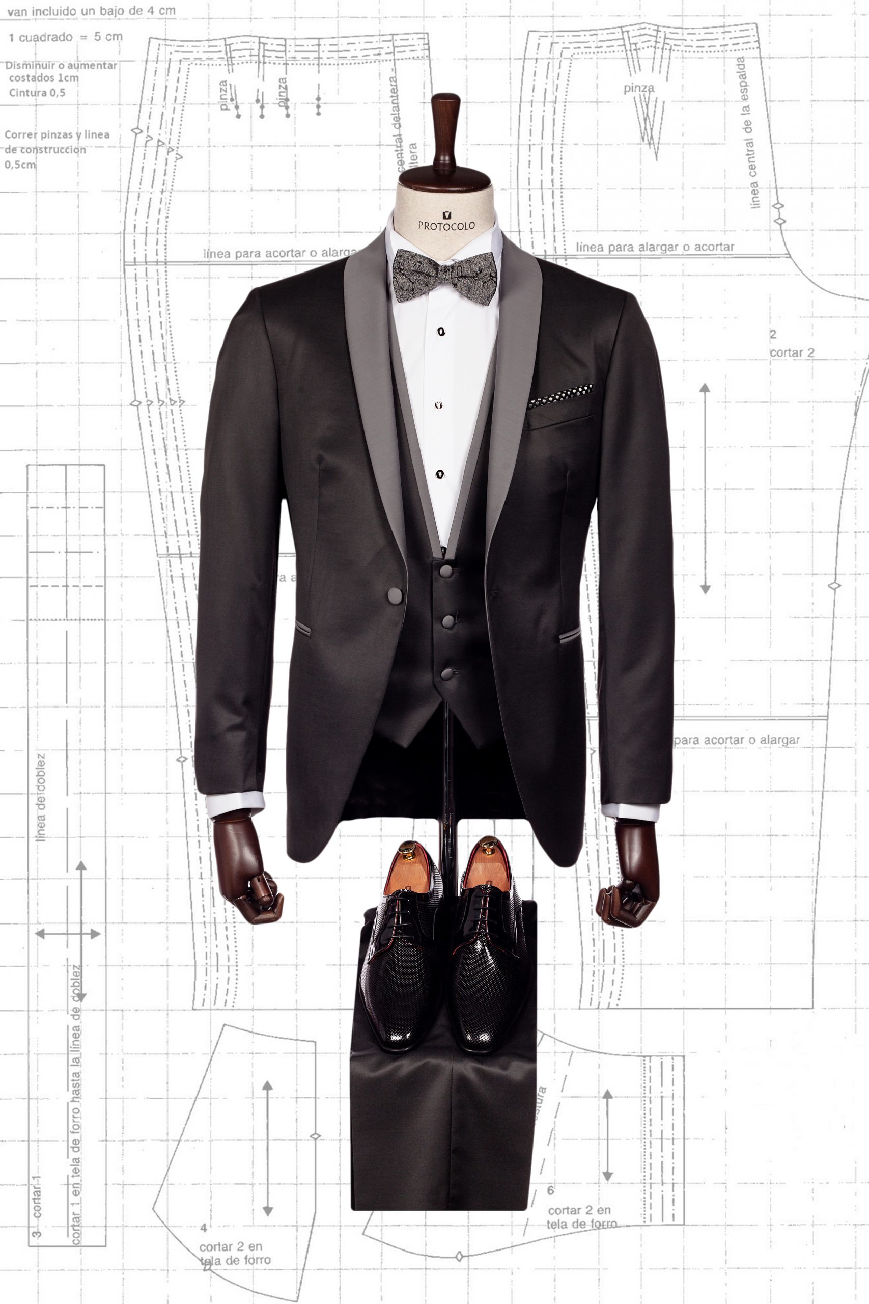 El smoking Lamata de color gris ceniza, que puede usarse con chaleco bajo vivo haciendo contraste al modelo Lamata y el detalle que dará el realce perfecto será la pajarita a rayas modelo Hidalgo. El smoking Lamata con un color clásico y mucha clase, es la mejor opción para tu boda bodas y fiestas más formales.