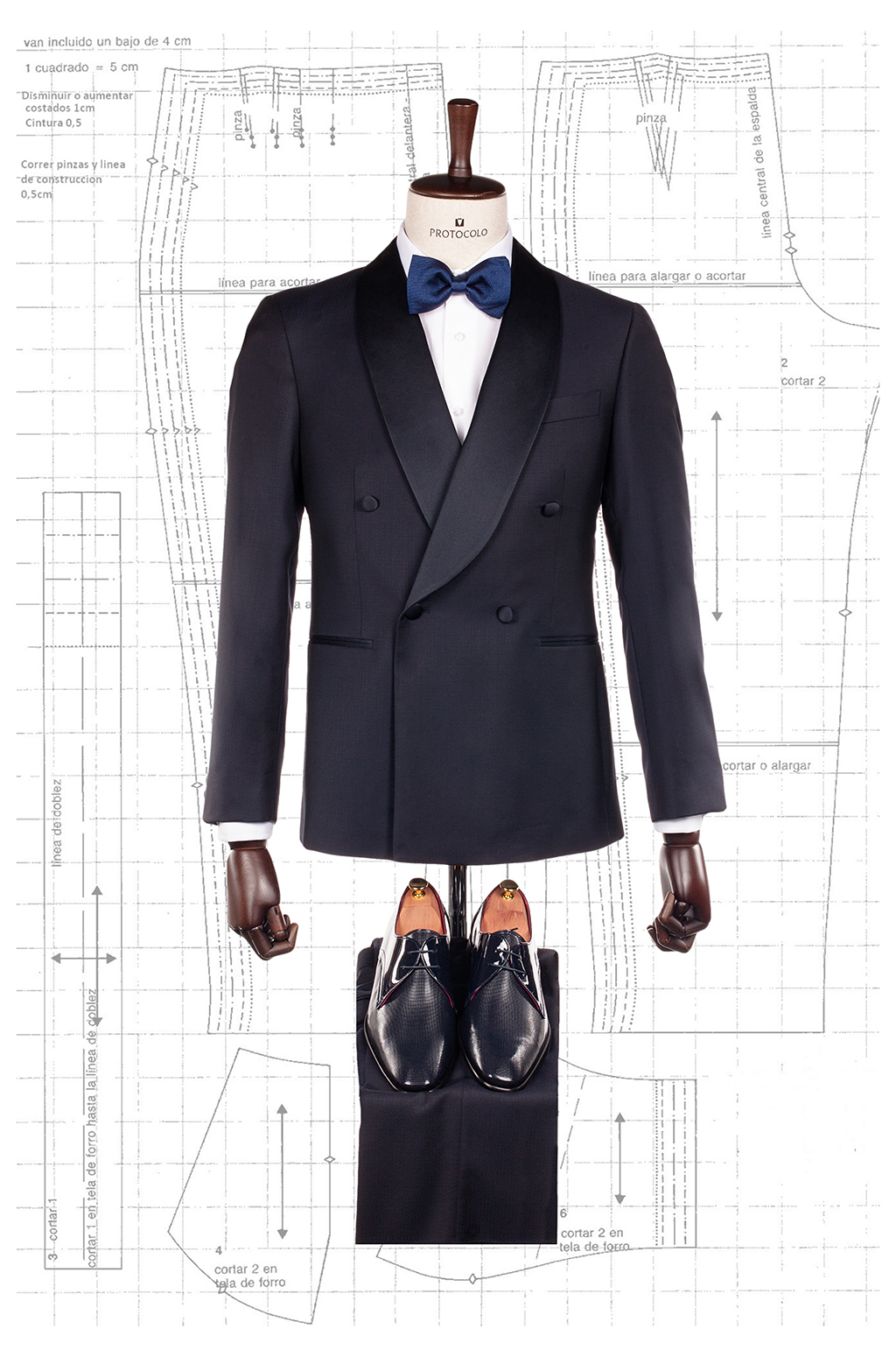 Smoking con microdibujo de rombos en color azul marino y pajarita azul marino modelo Piña.