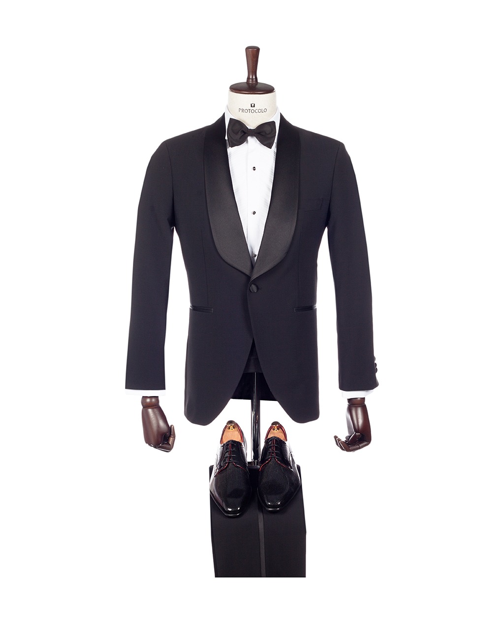 Una deslumbrante opción para realzar tu look de etiqueta, este smoking de dos piezas en negro Yucatán está confeccionado en pura lana S120s del telar italiano Marzotto, con un corte entallado. Compuesto por un saco con solapa redonda forrada en seda, hombros armados, botón único forrado en seda y una sola abertura.