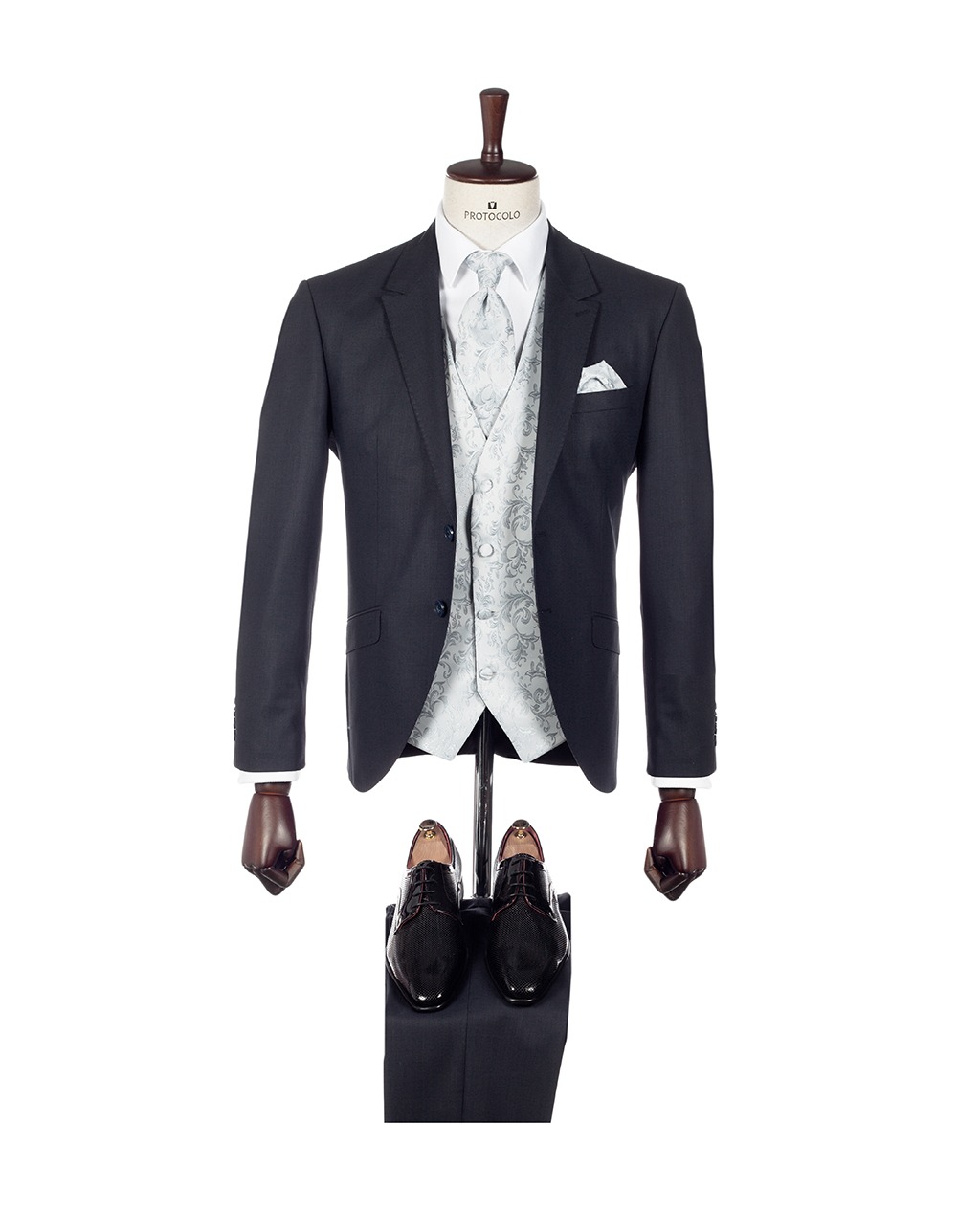 Traje negro entallado con solapa de muesca con pespuntes al hilo. Después de la boda este traje permite ser utilizado en muchas otras ocasiones.