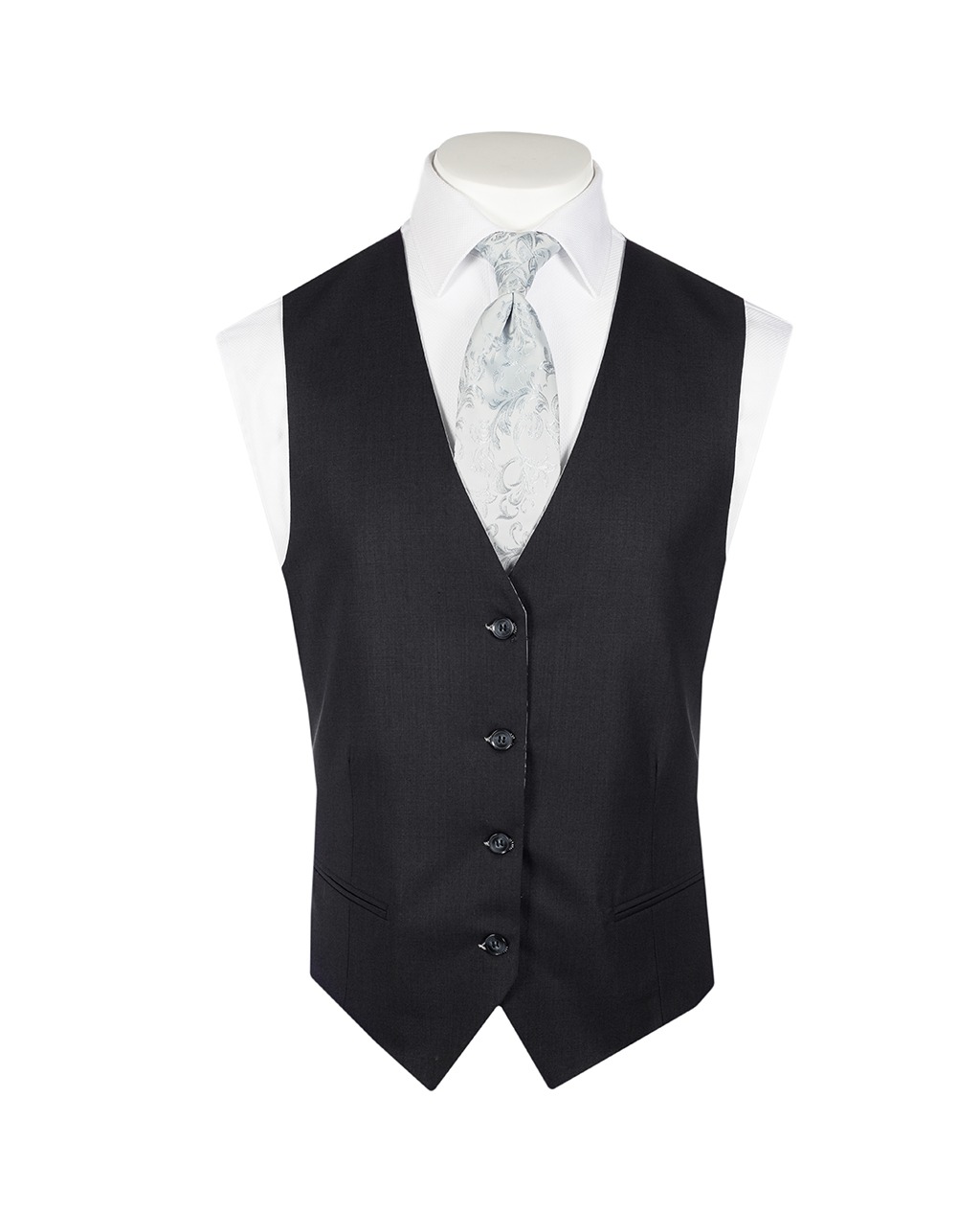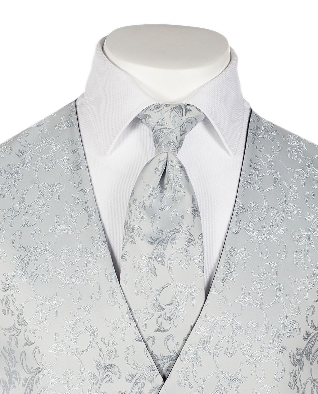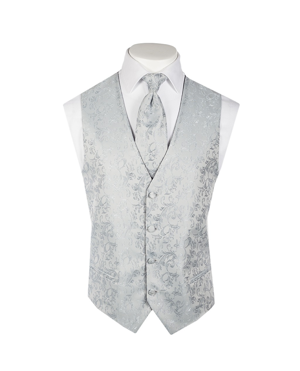 Combinado con chaleco Lorenzo blanco con grecas en color perla conservando un corte de botonadura recta.